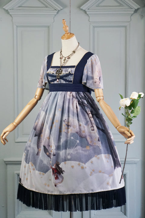 A dress printed with a fantastical world of white bears and a young girl,