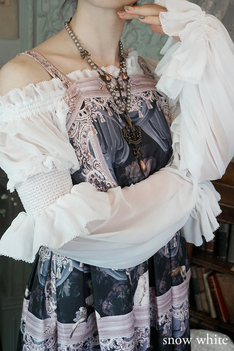 ドレスに重ねると襟元のギャザーに豊かな陰影を添えます。