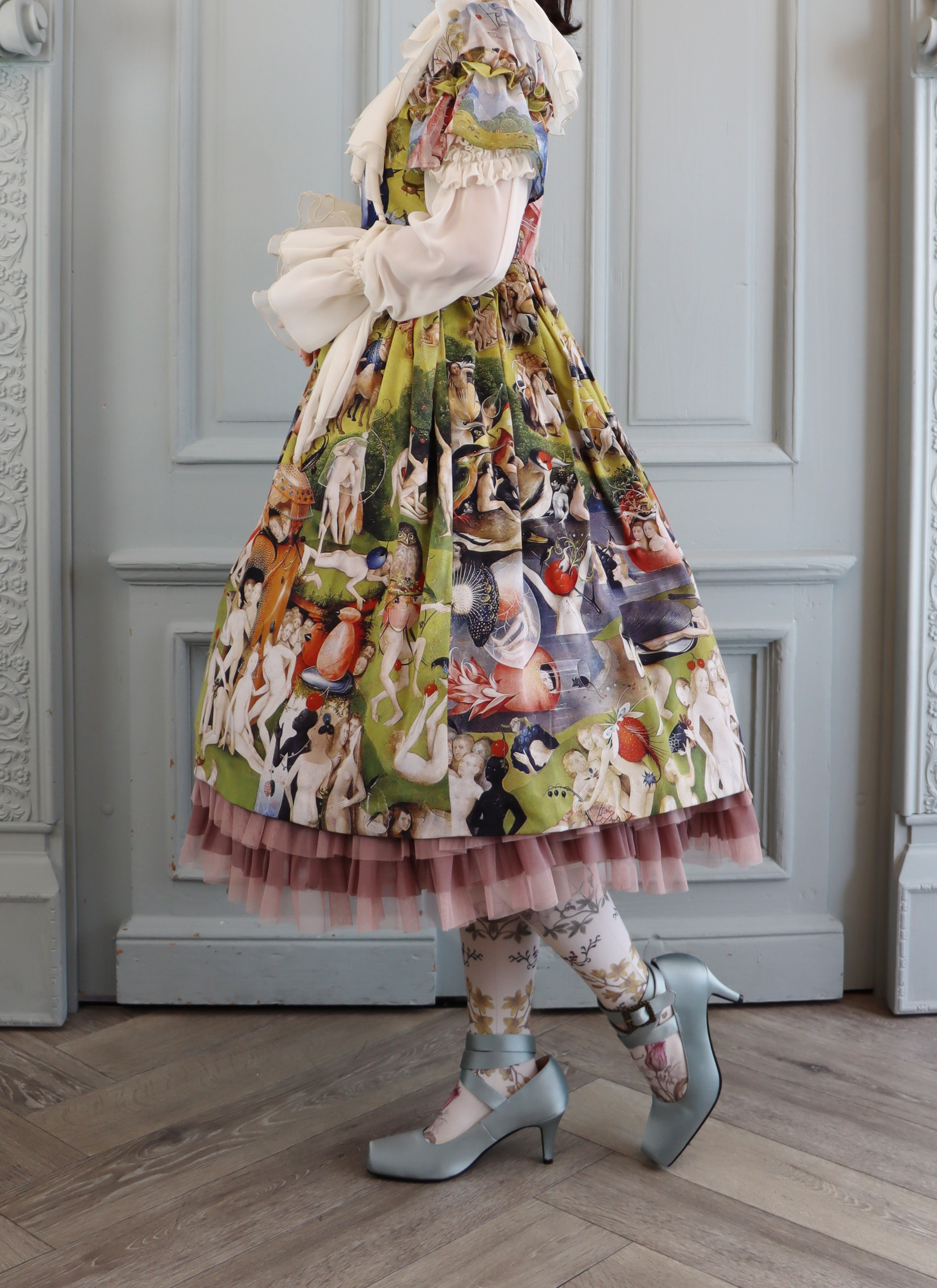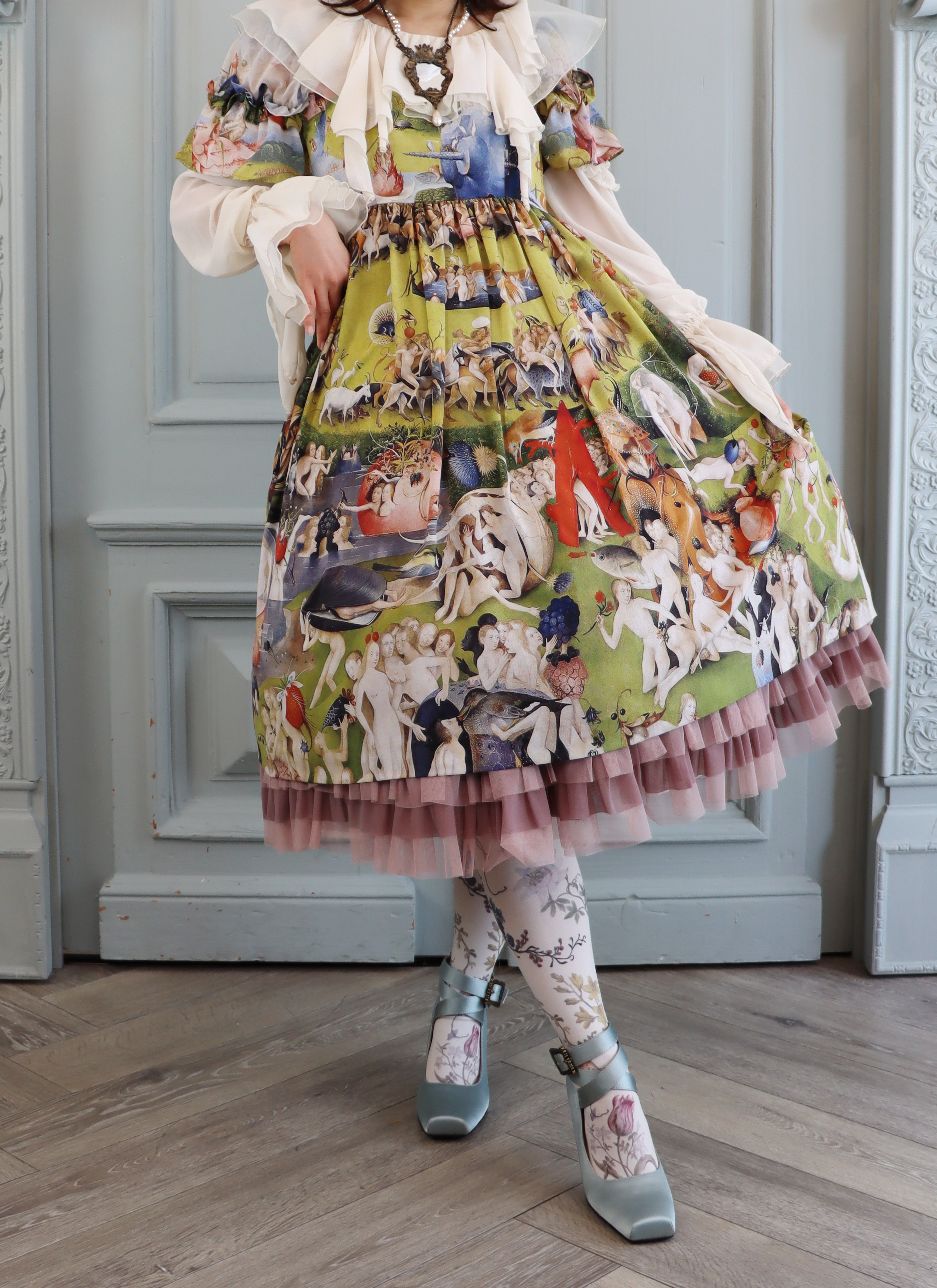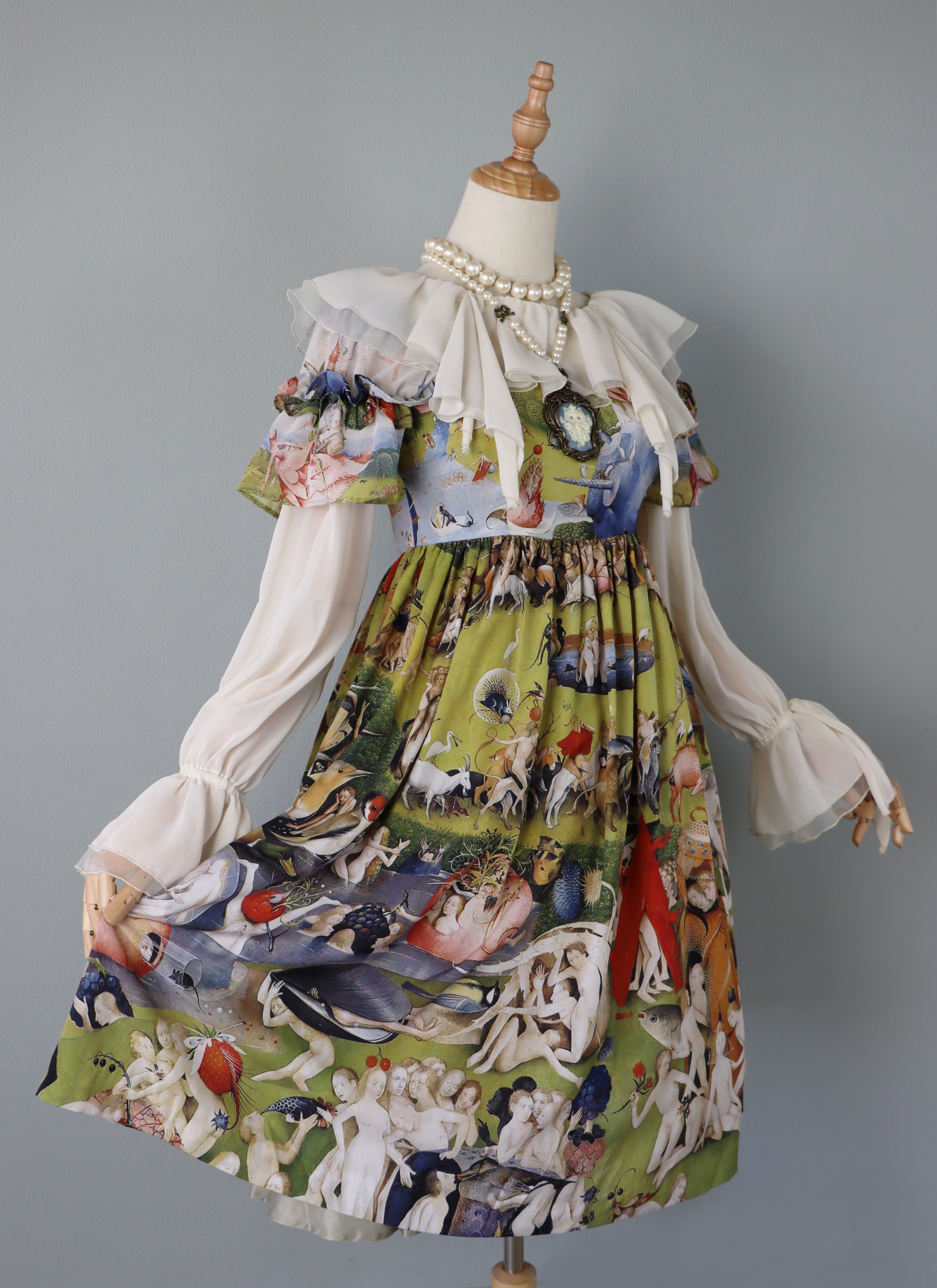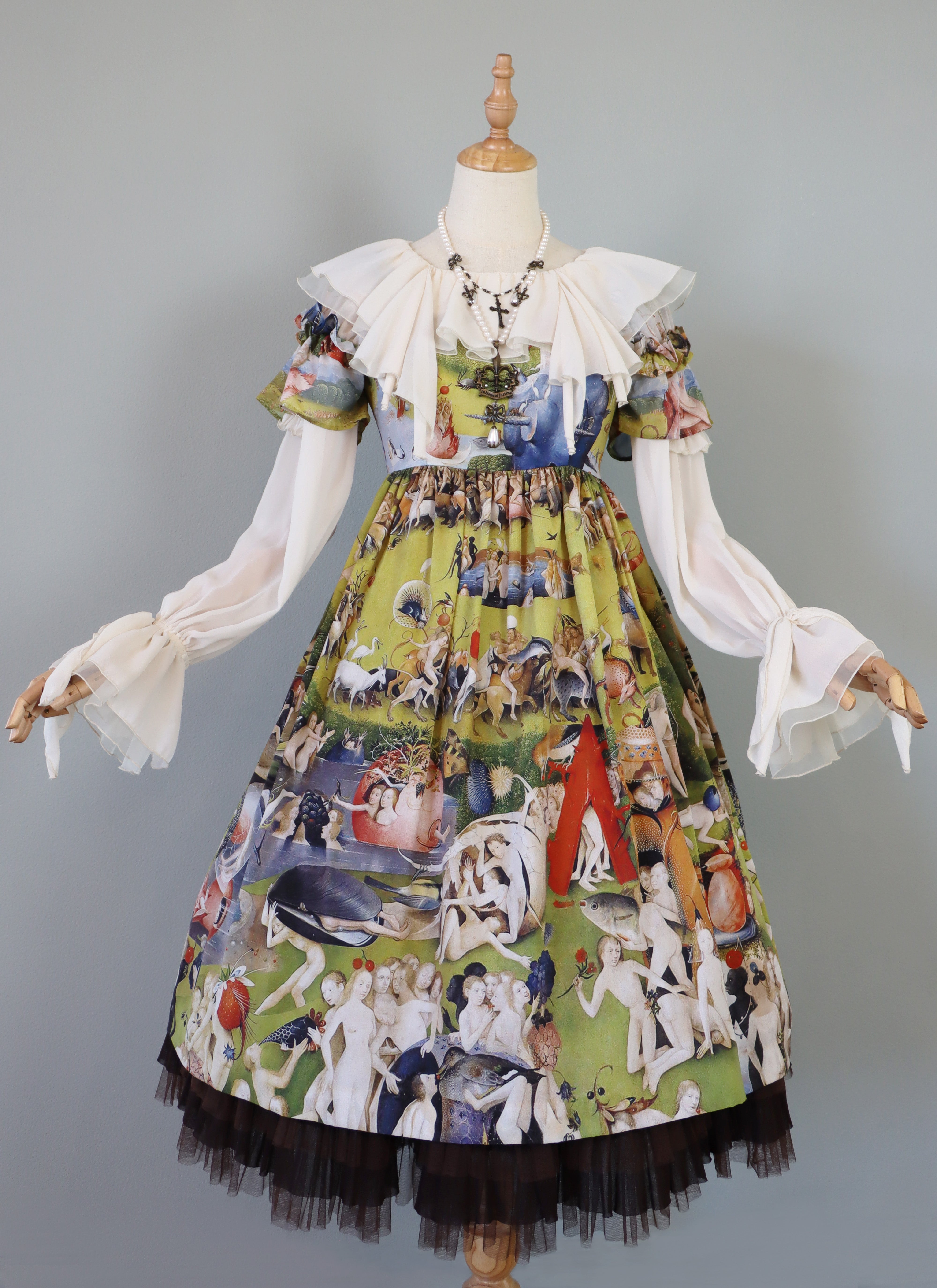 袖はシフォン×デシンの切替えに、重ねられた両山フリル。
