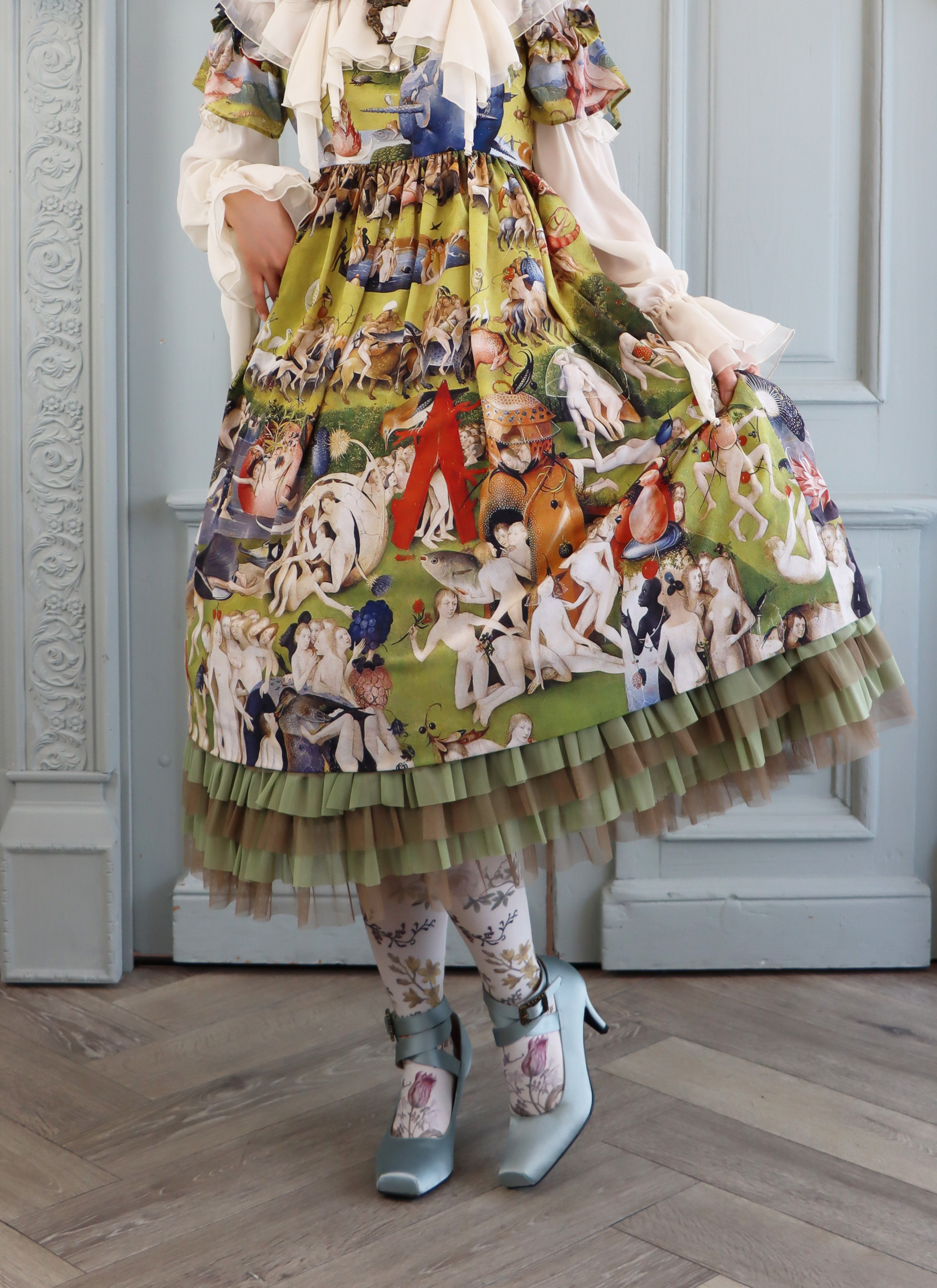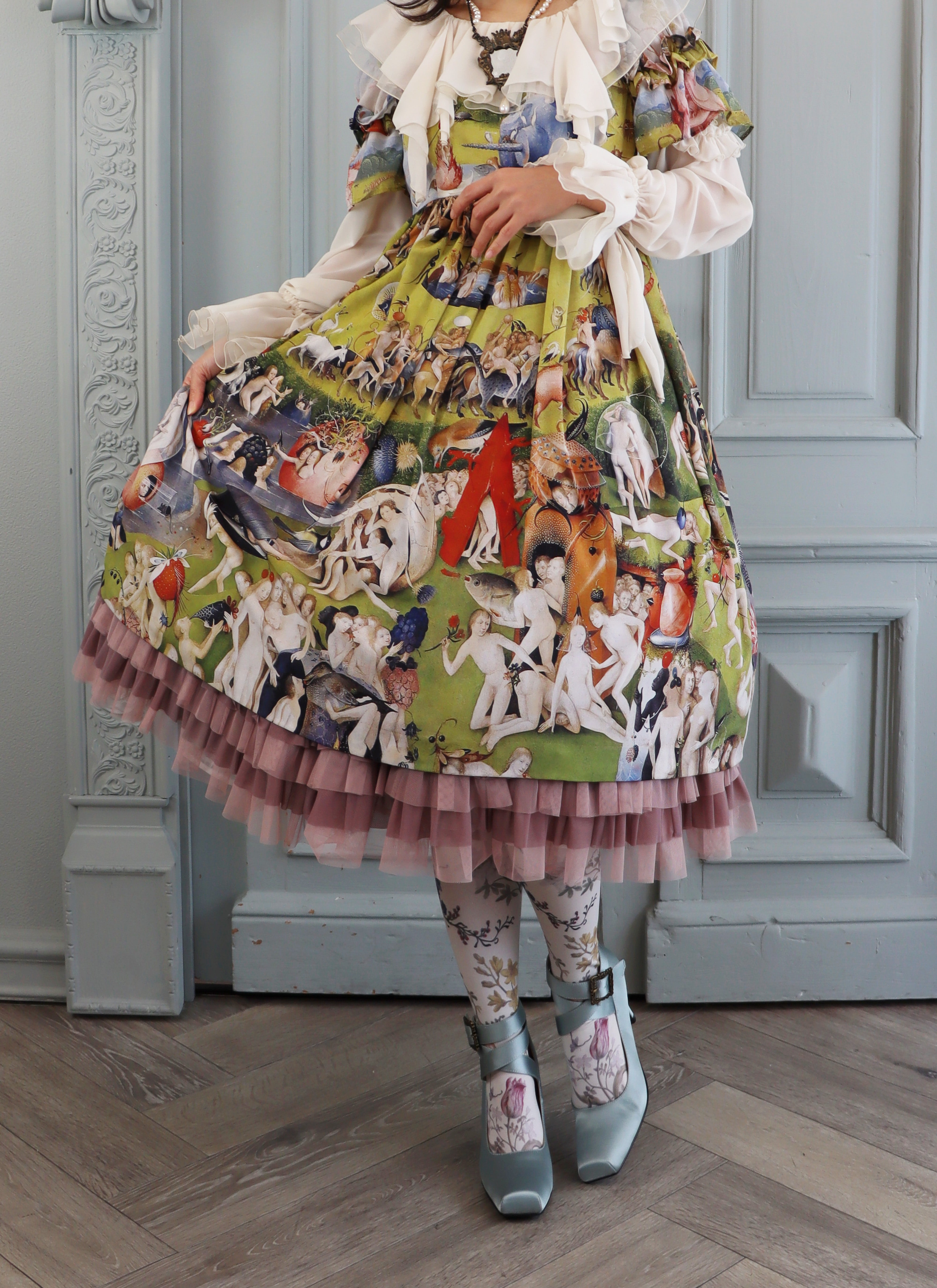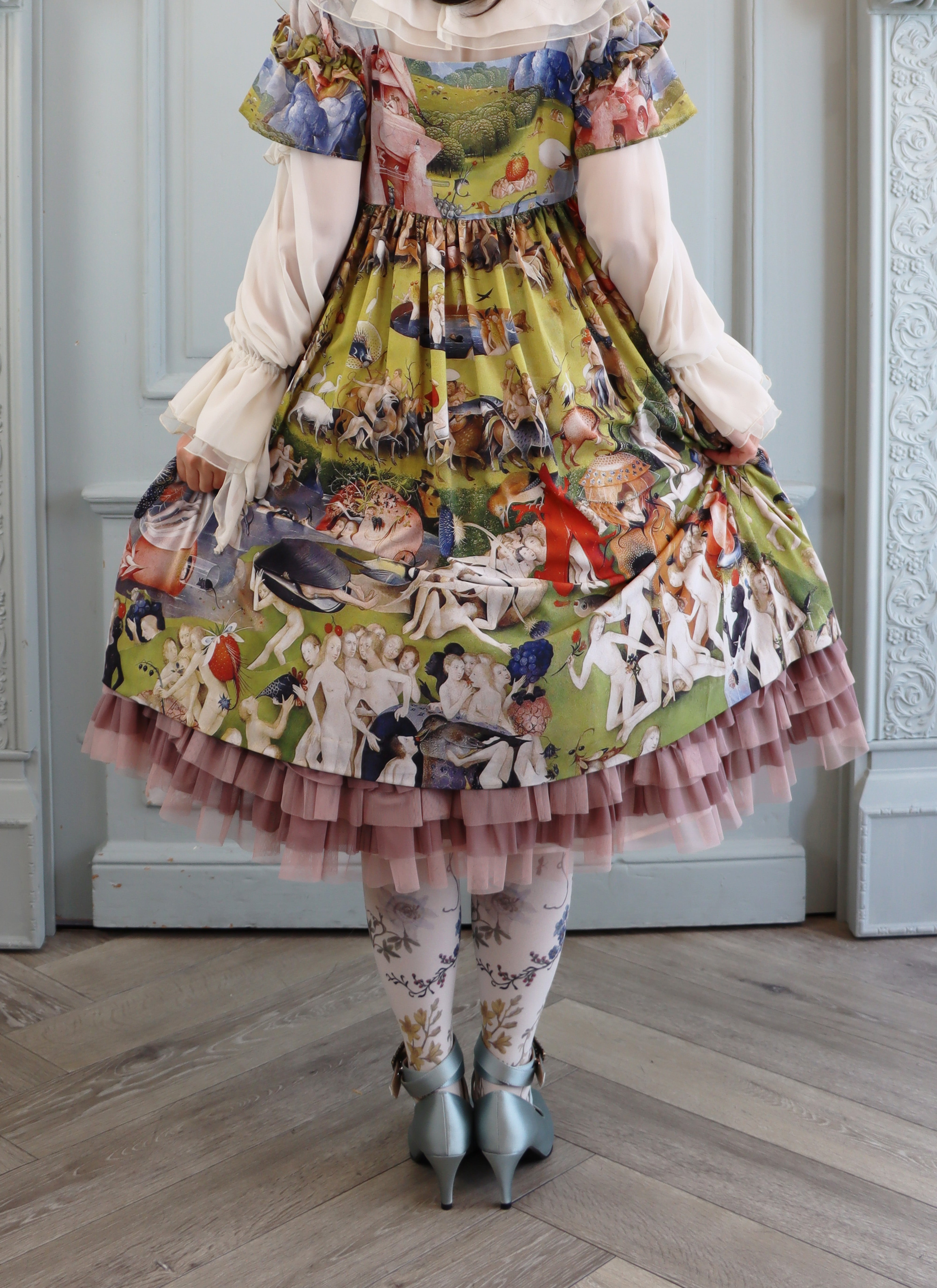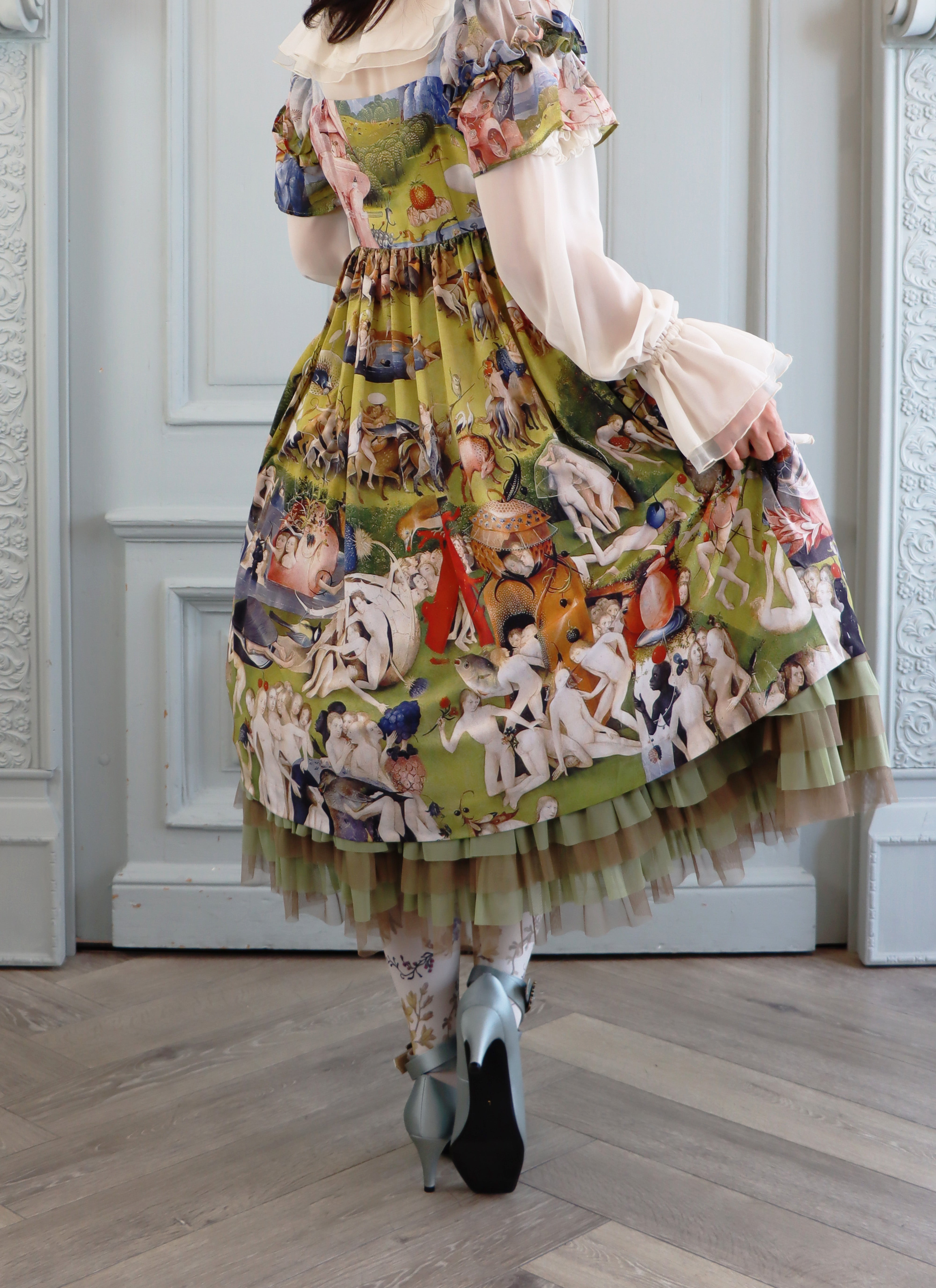 袖はシフォン×デシンの切替えに、重ねられた両山フリル。
