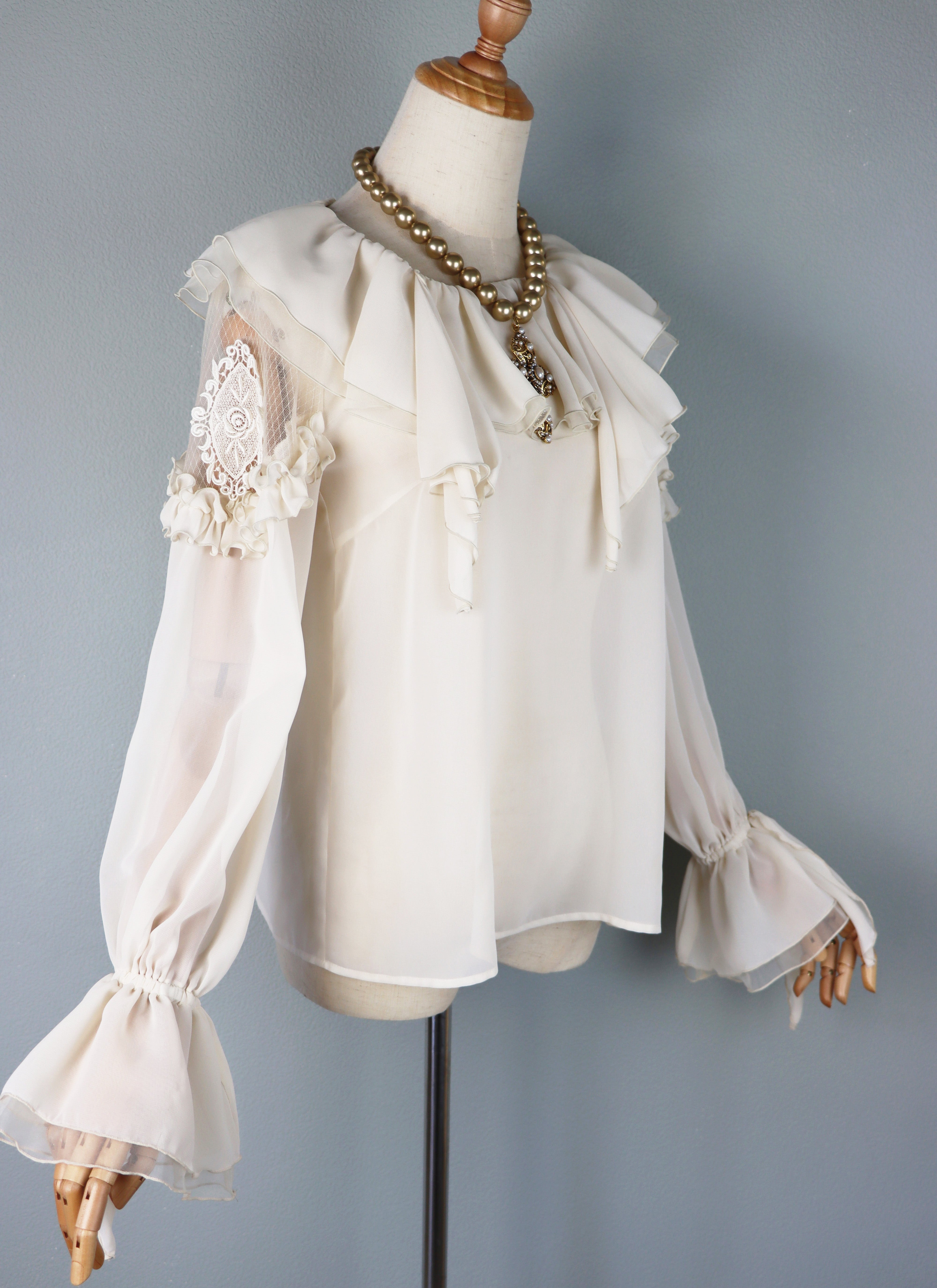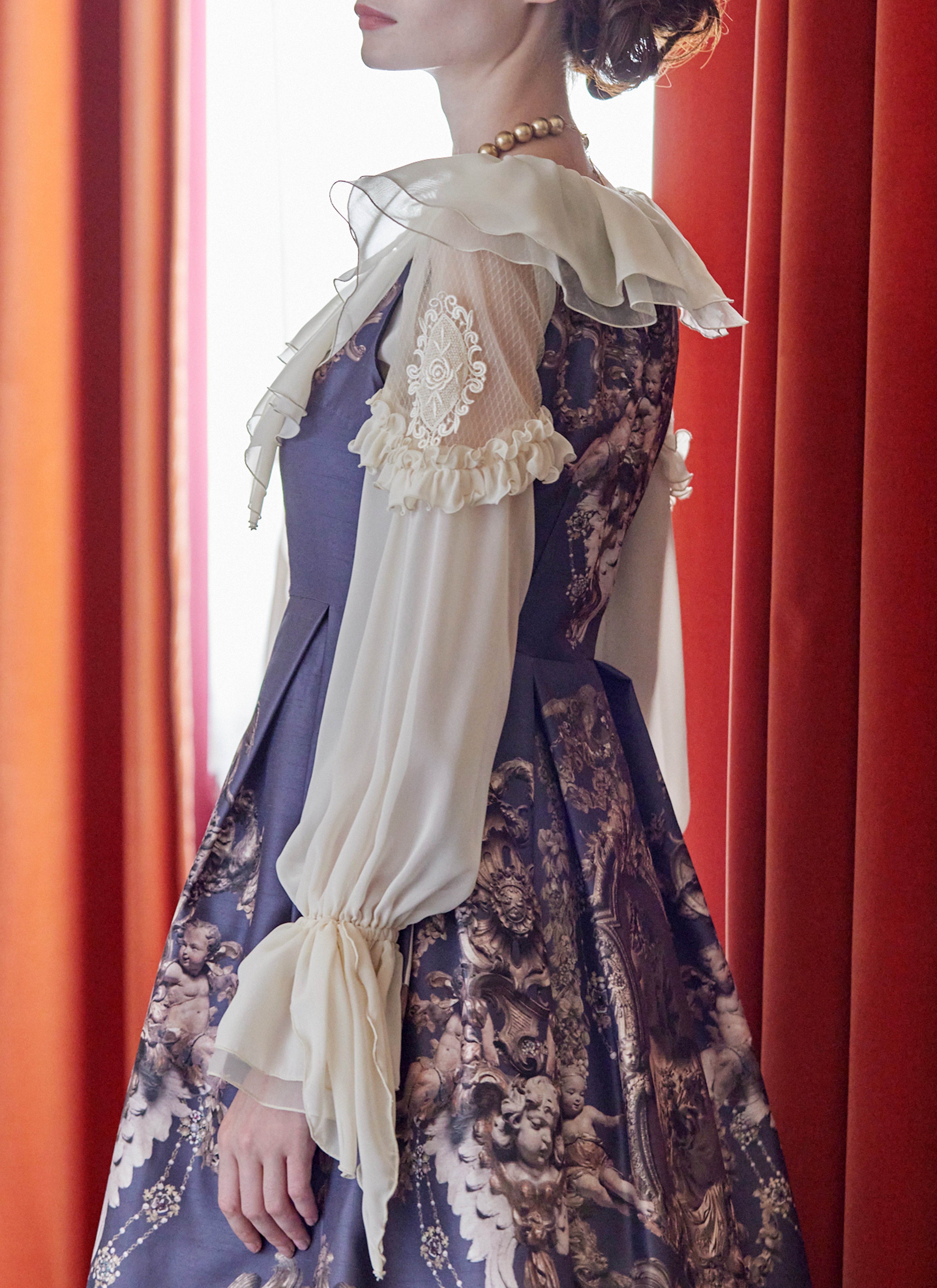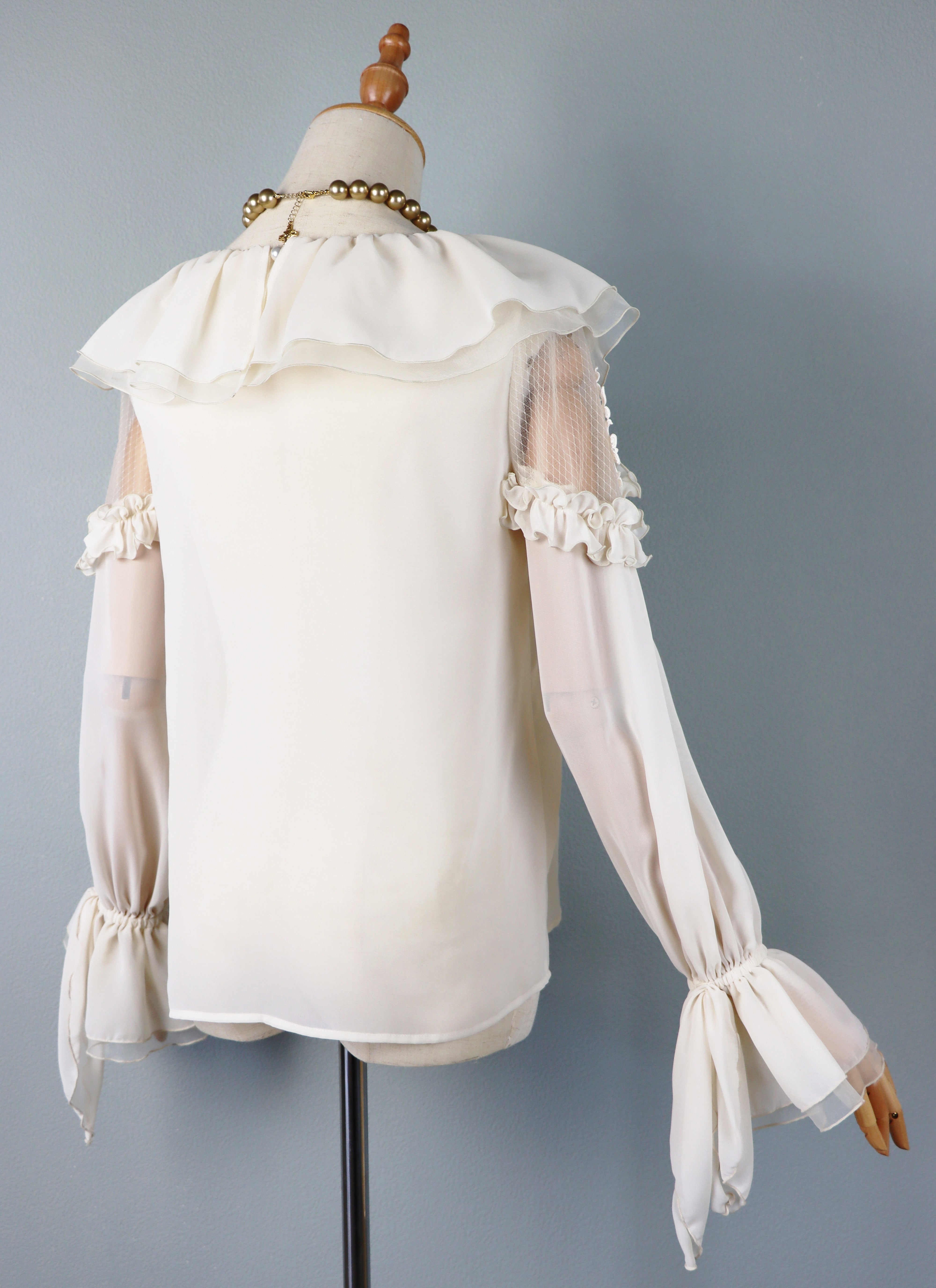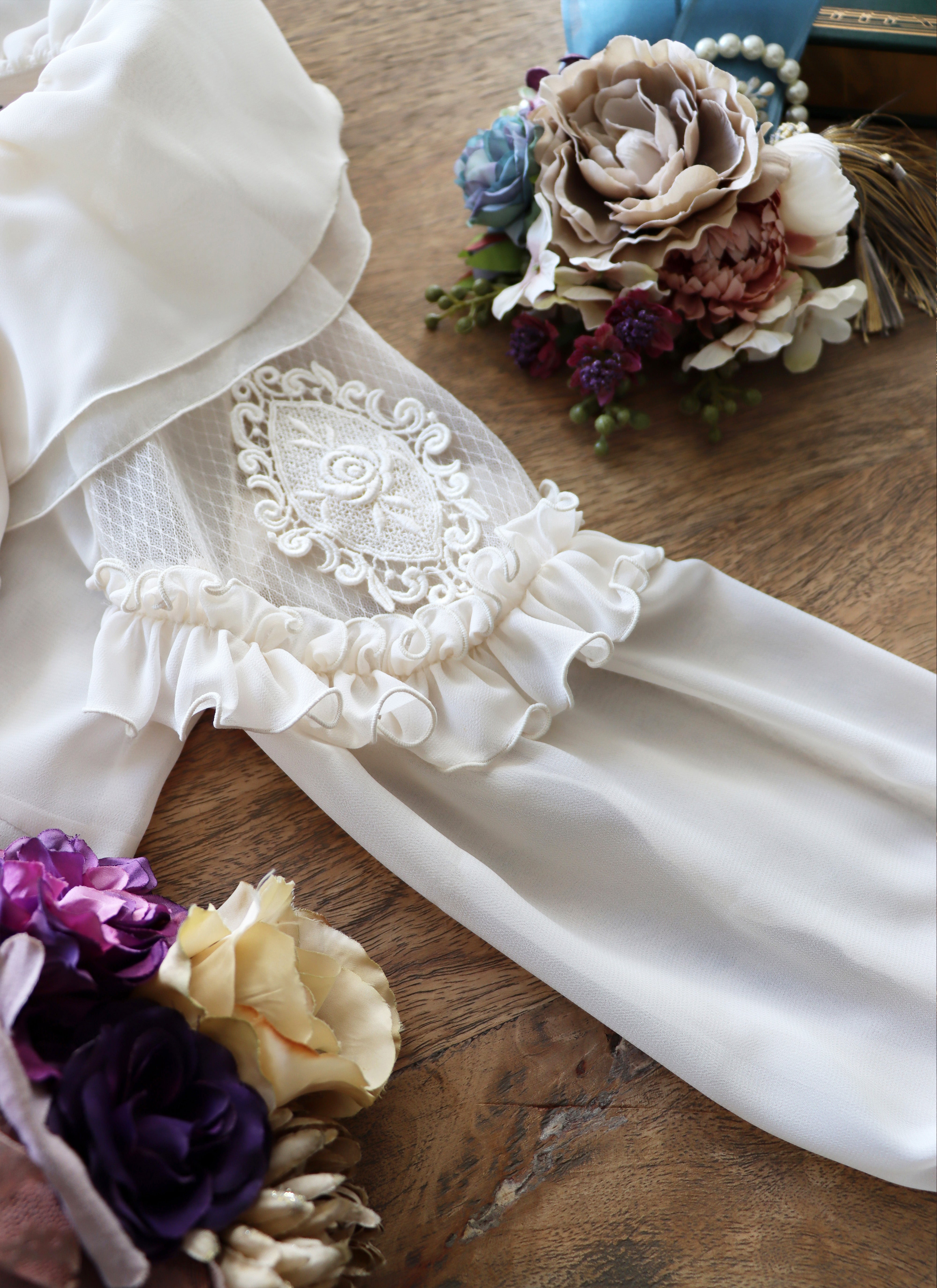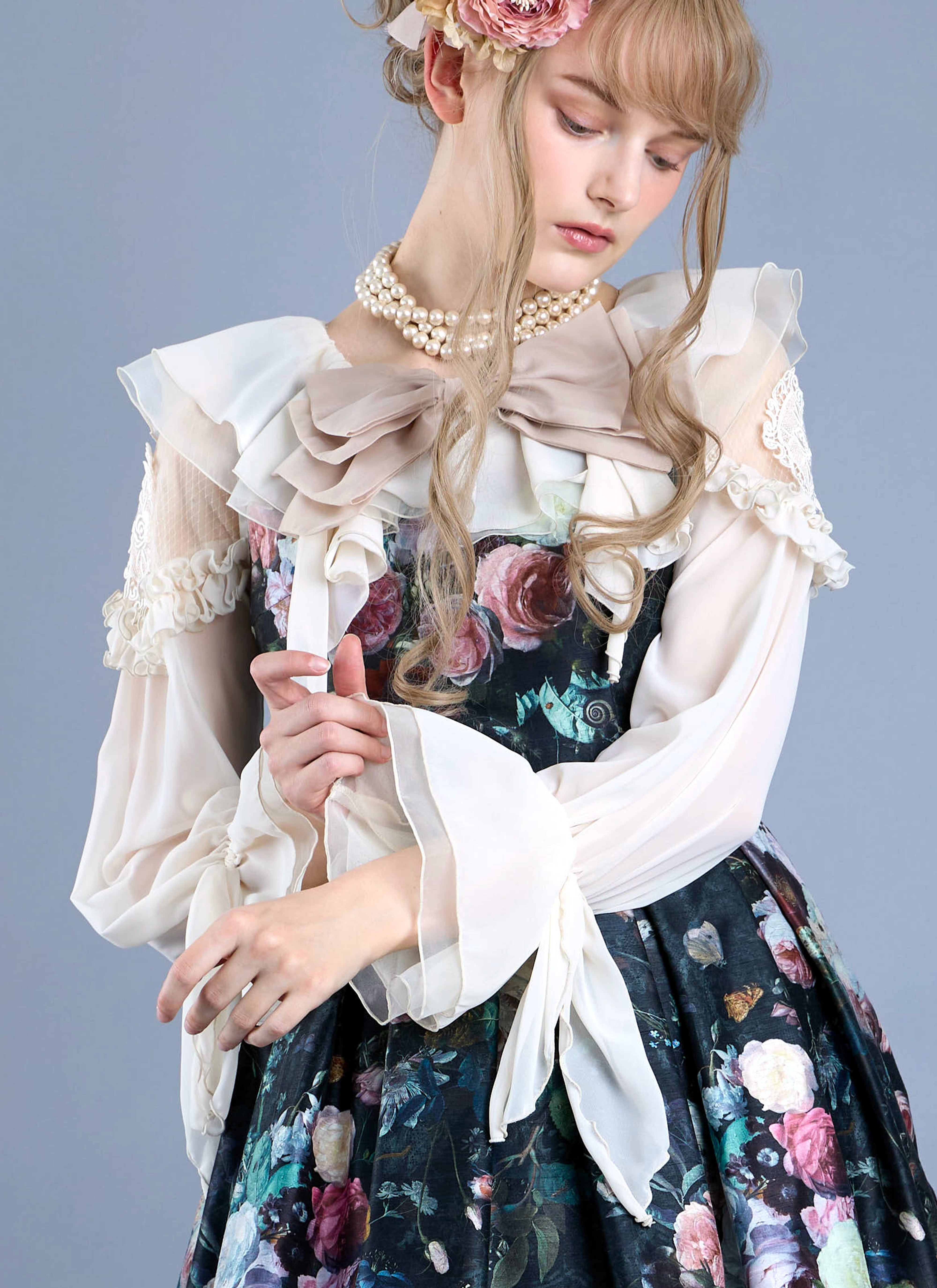 襟は、シフォン×オーガンジーのカスケードフリル。