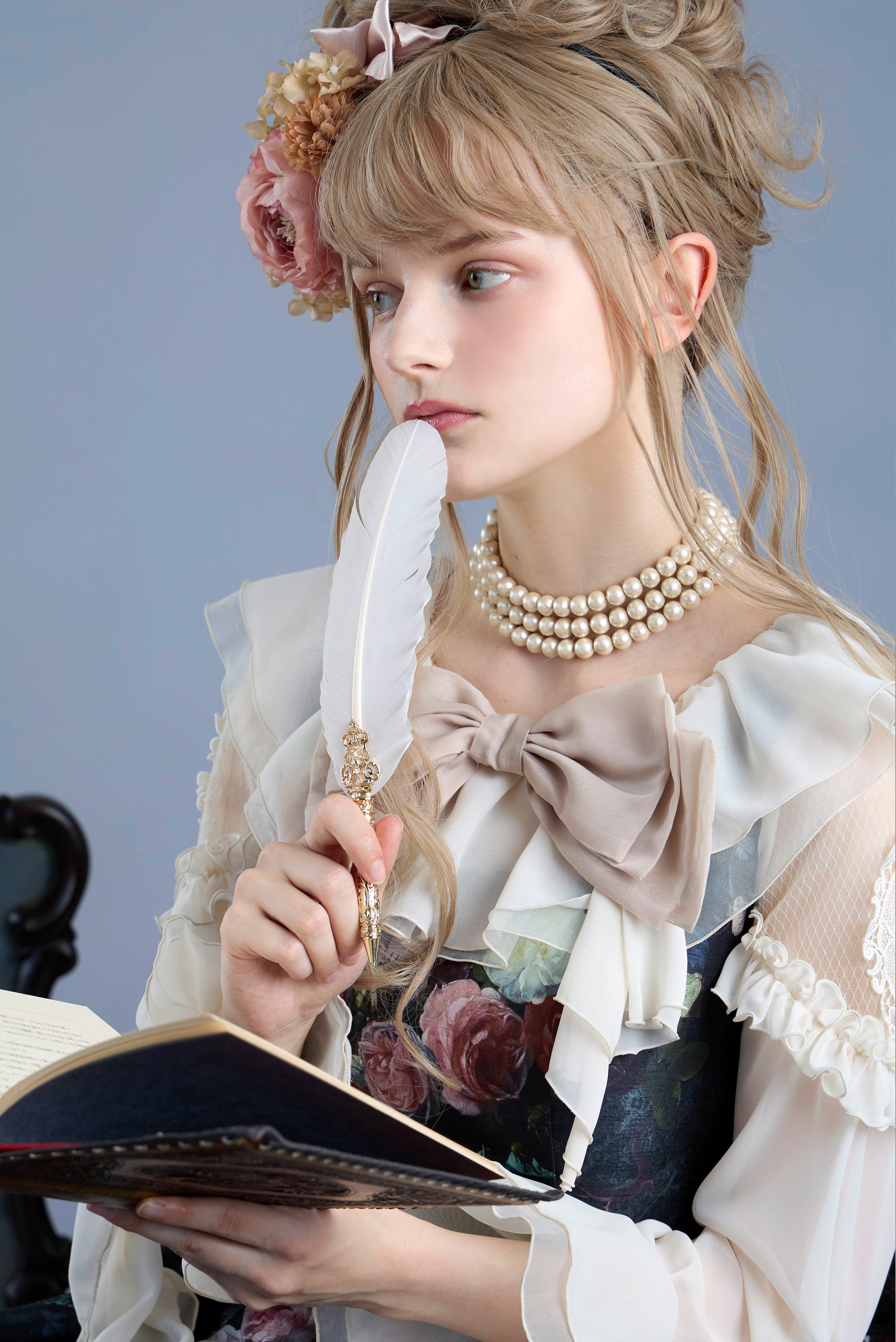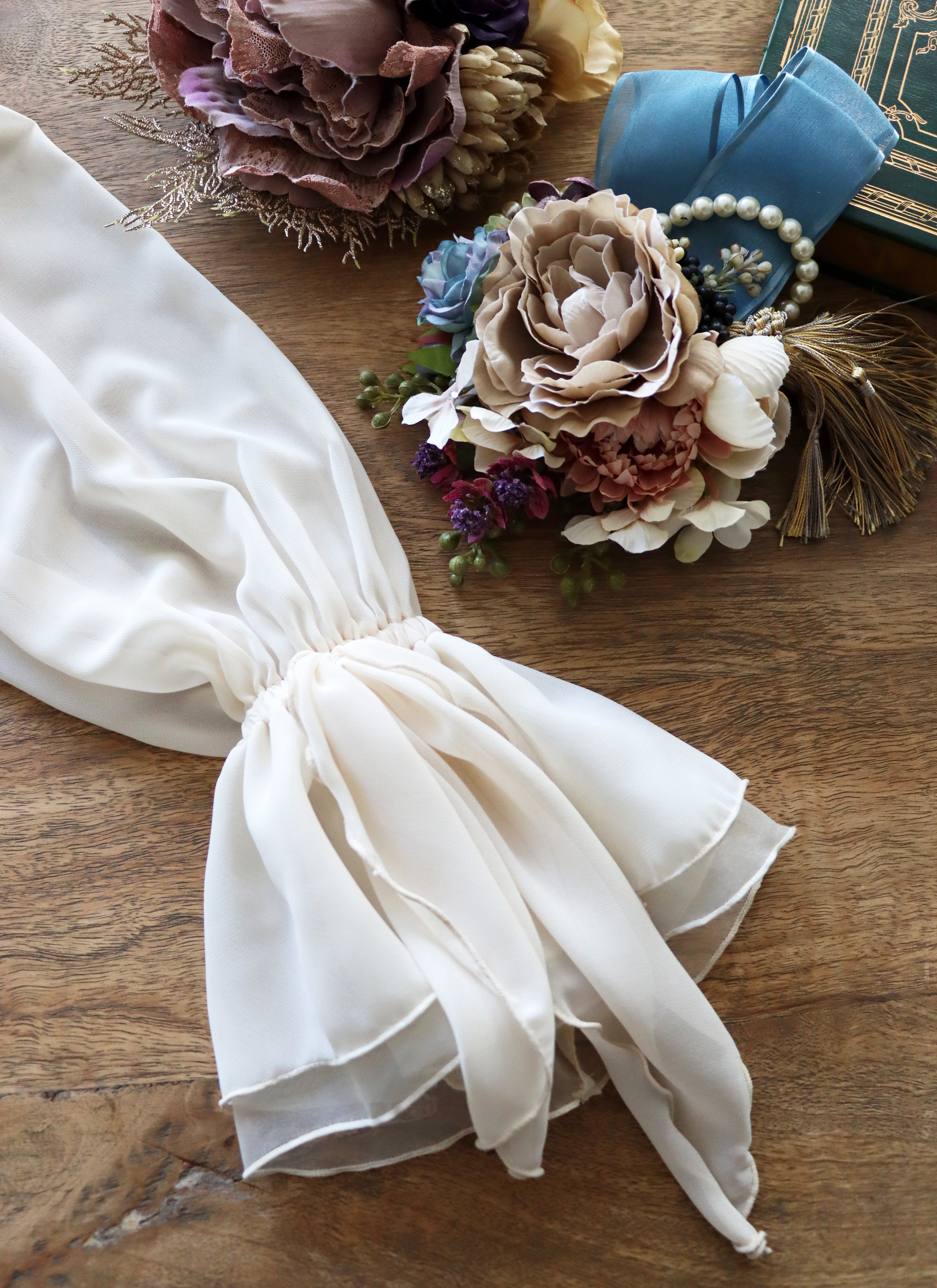 肩に霧を置く。ドレスの物語を、静かに際立たせる。
