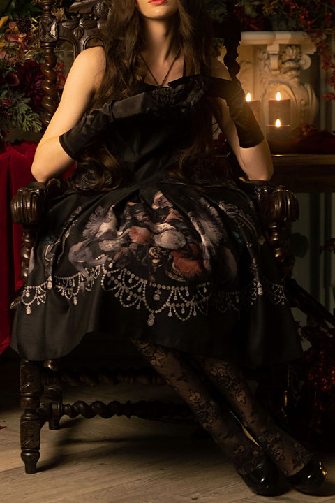 JeJ比率のドレスにはスカートのプリント配置が裾まで計算されておりパニエを着用していない場合も美しいバランスになるようにデザインされております、またスカートの裾回りの長さを最大にとりパニエ着用時はより華やかな印象を与えます。