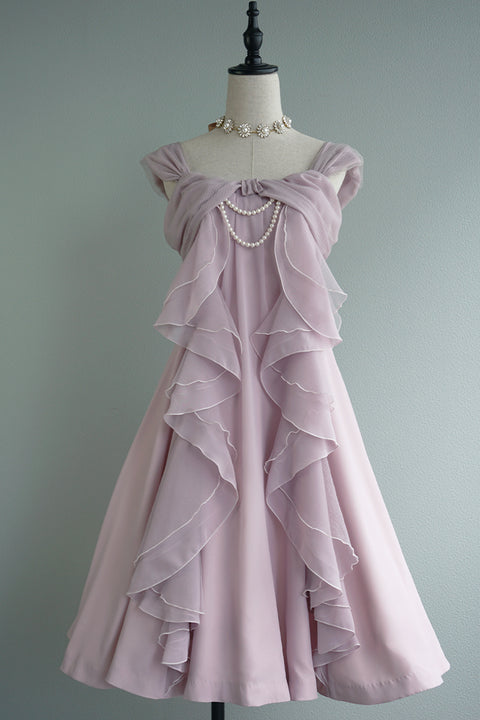 魅惑的で優しく、S字型のフリルにシャンタンが三枚づつ重ねられ、