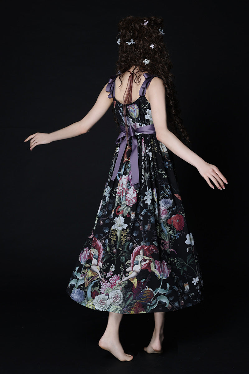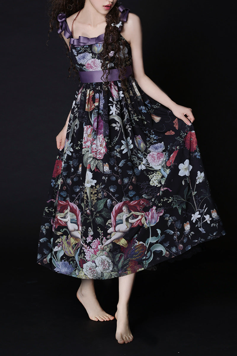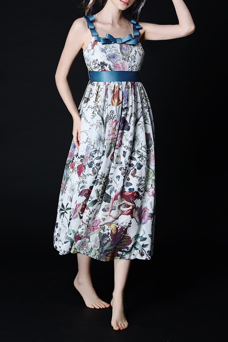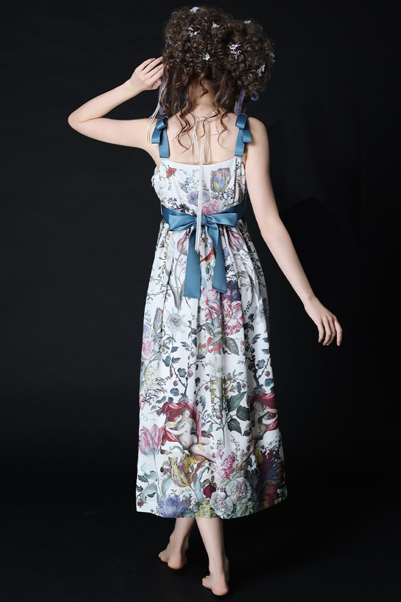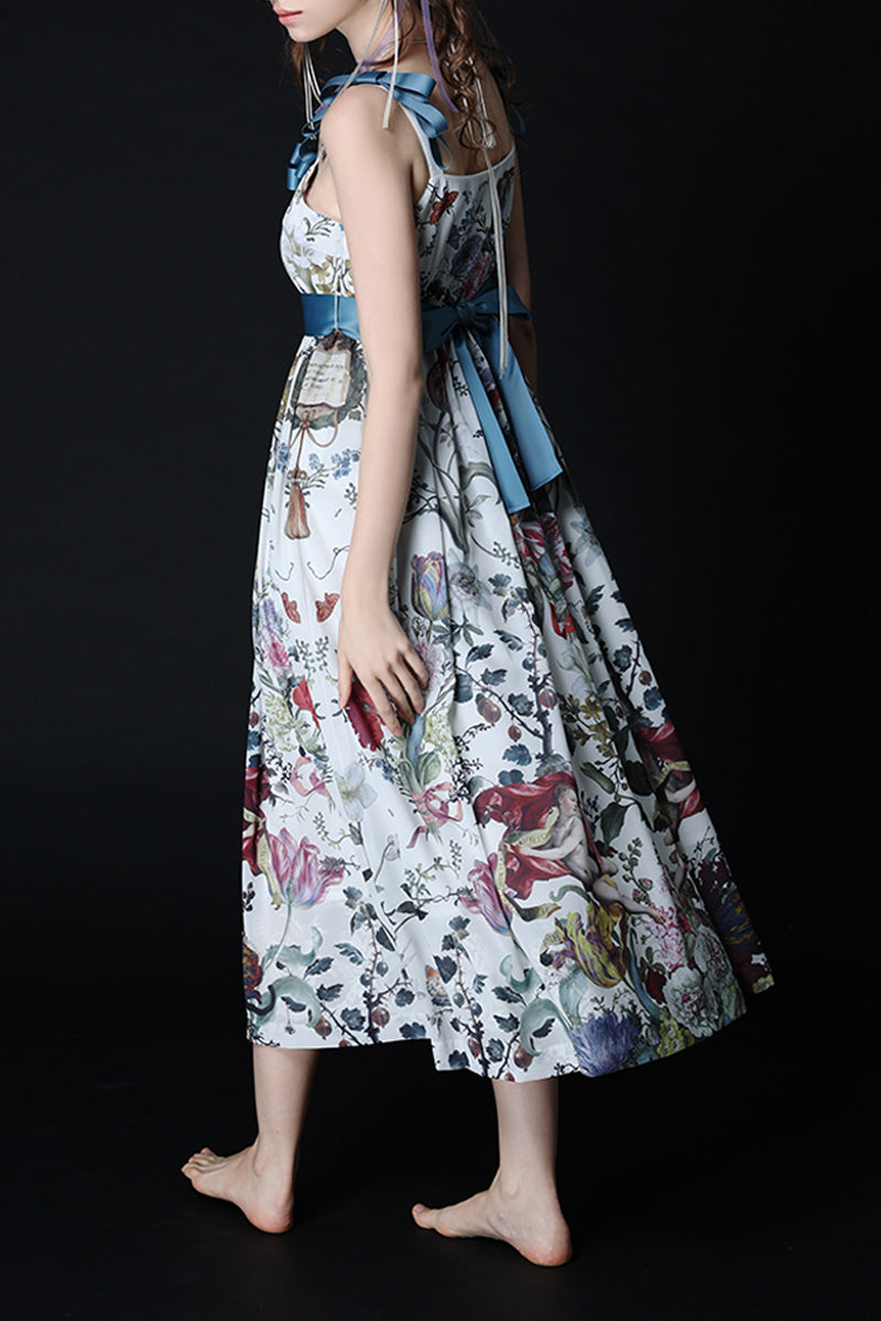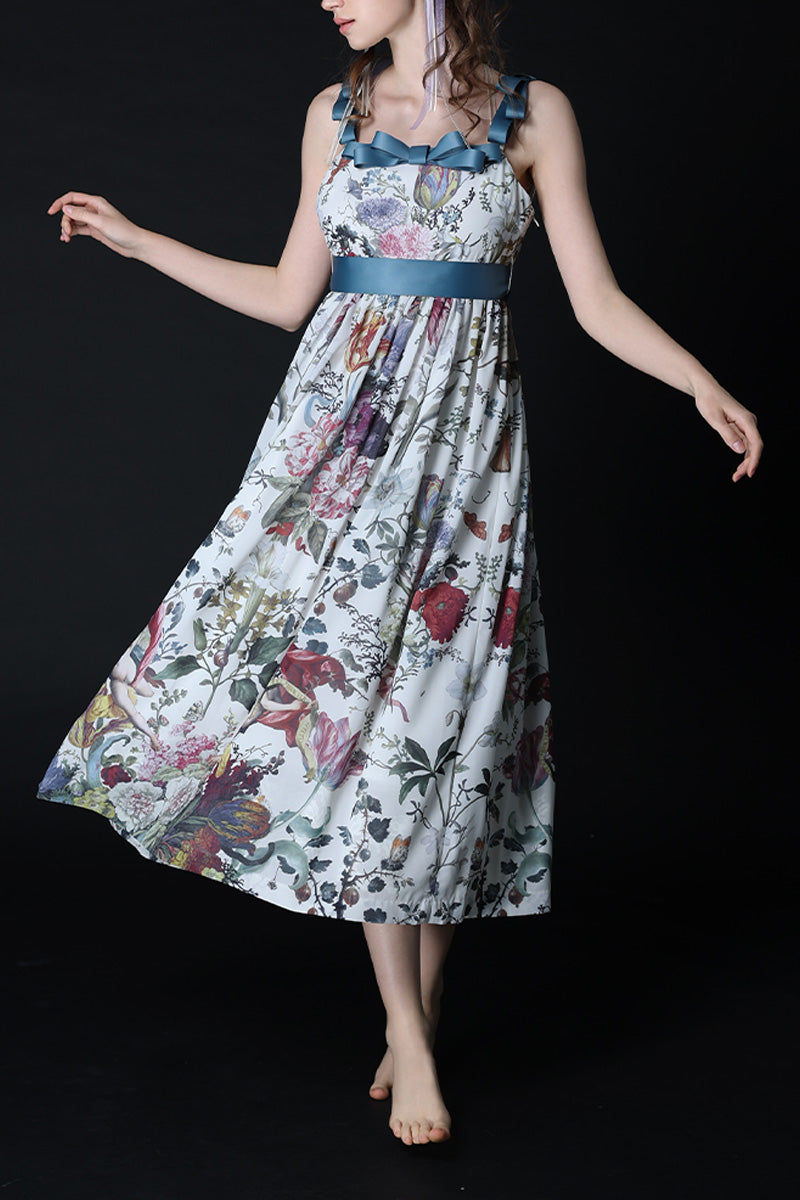 裙子胸口处设计有蓝色和紫色两种色彩的丝带,