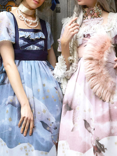 柄图是以北极熊与女孩幻想世界为题的印花裙子。